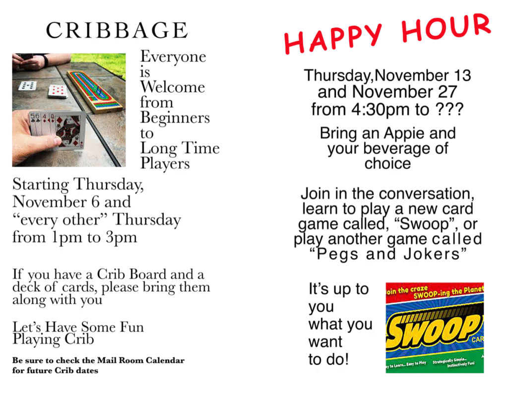 9 am every Monday, Wednesday, Friday in the Clubhouse.